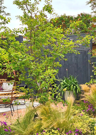 A day-to-night garden for all the family, complete with relaxing terraces, a lawn for playtime and some special sensory elements added.